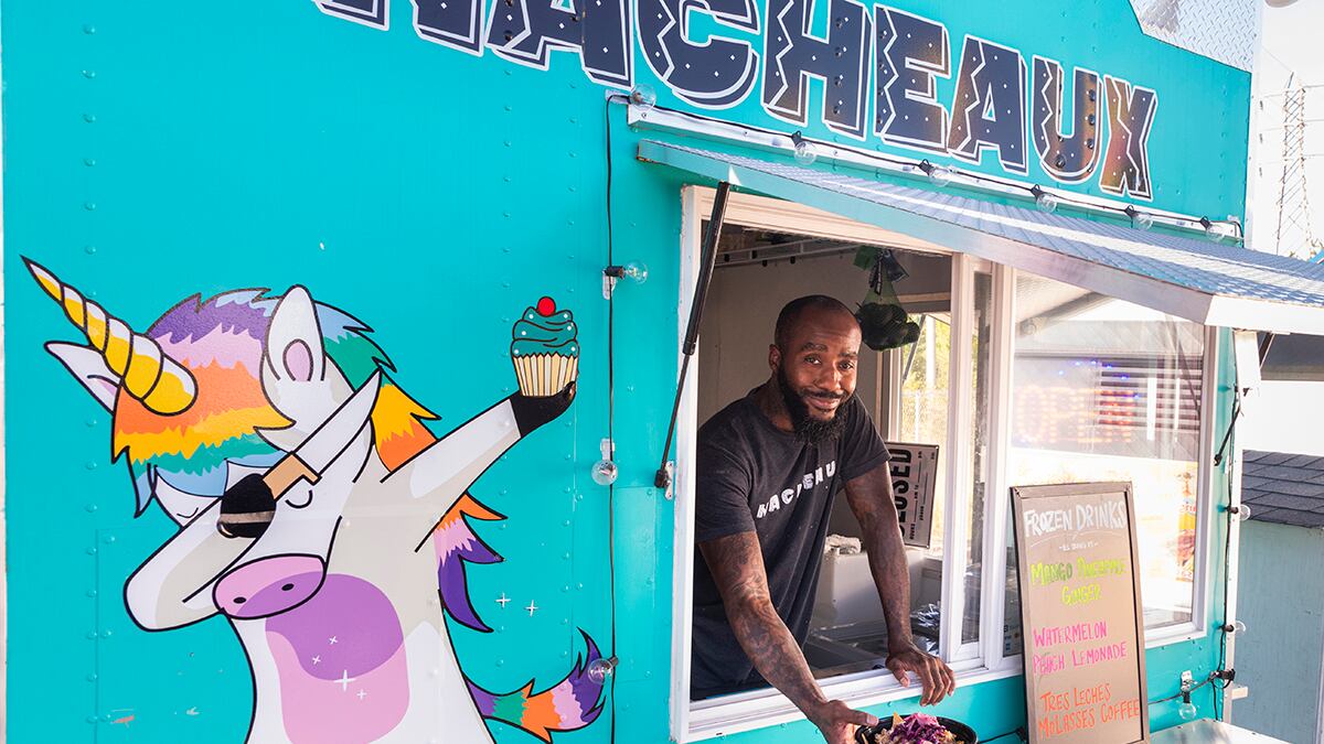 At Anthony Brown's garishly teal-colored food truck, Mexican favorites get hitched to Southern food and Cajun-Creole flavors, as in Brown's own life. The 34-year-old Los Angeles native grew up with both a grandmother in Georgia and a stepfather from Mexico.