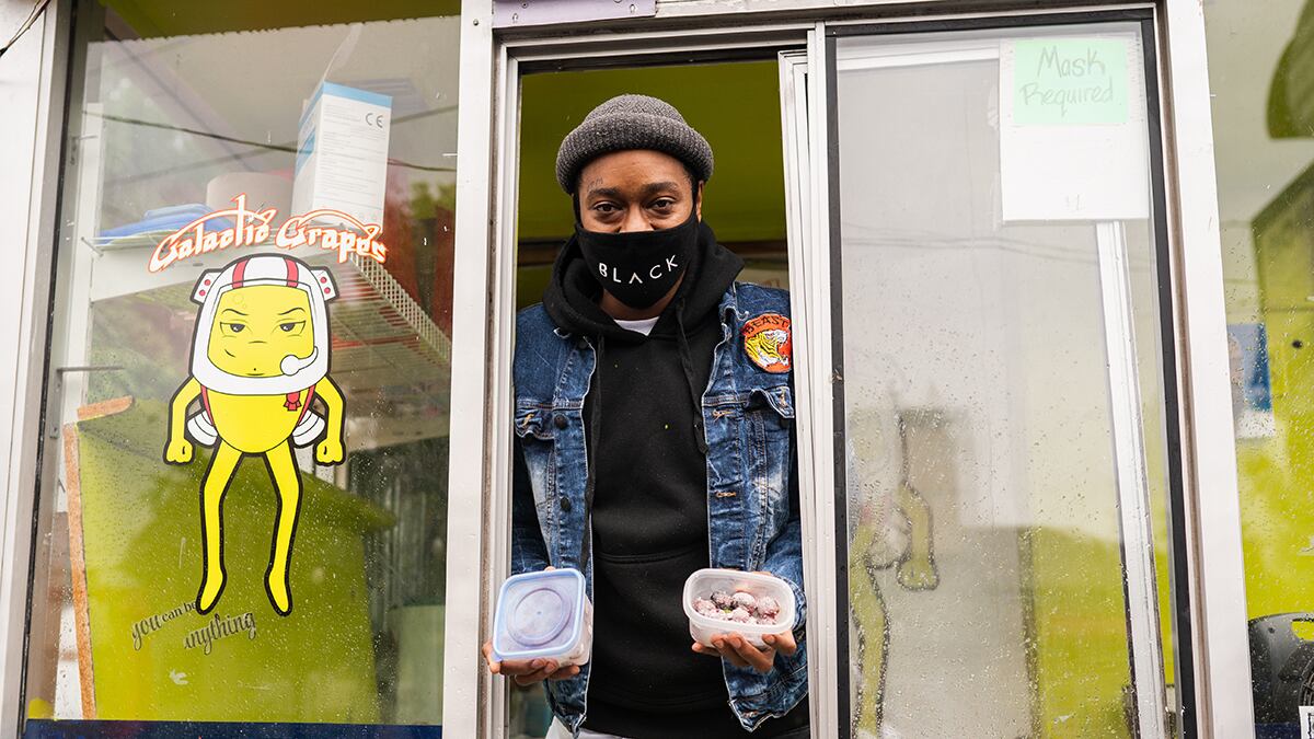 But the community's role in the success of Galactic Grapes goes beyond consistent patronage—it's a critical link in the cart's supply chain. Friends have willingly deputized themselves as scouts, reporting on grape sales across Portland supermarkets, and donate bunches picked up on their own grocery store runs. In turn, Carmichael and Montgomery allow friends in need of work and quick cash to run the operation for a shift or two and keep the day's earnings.