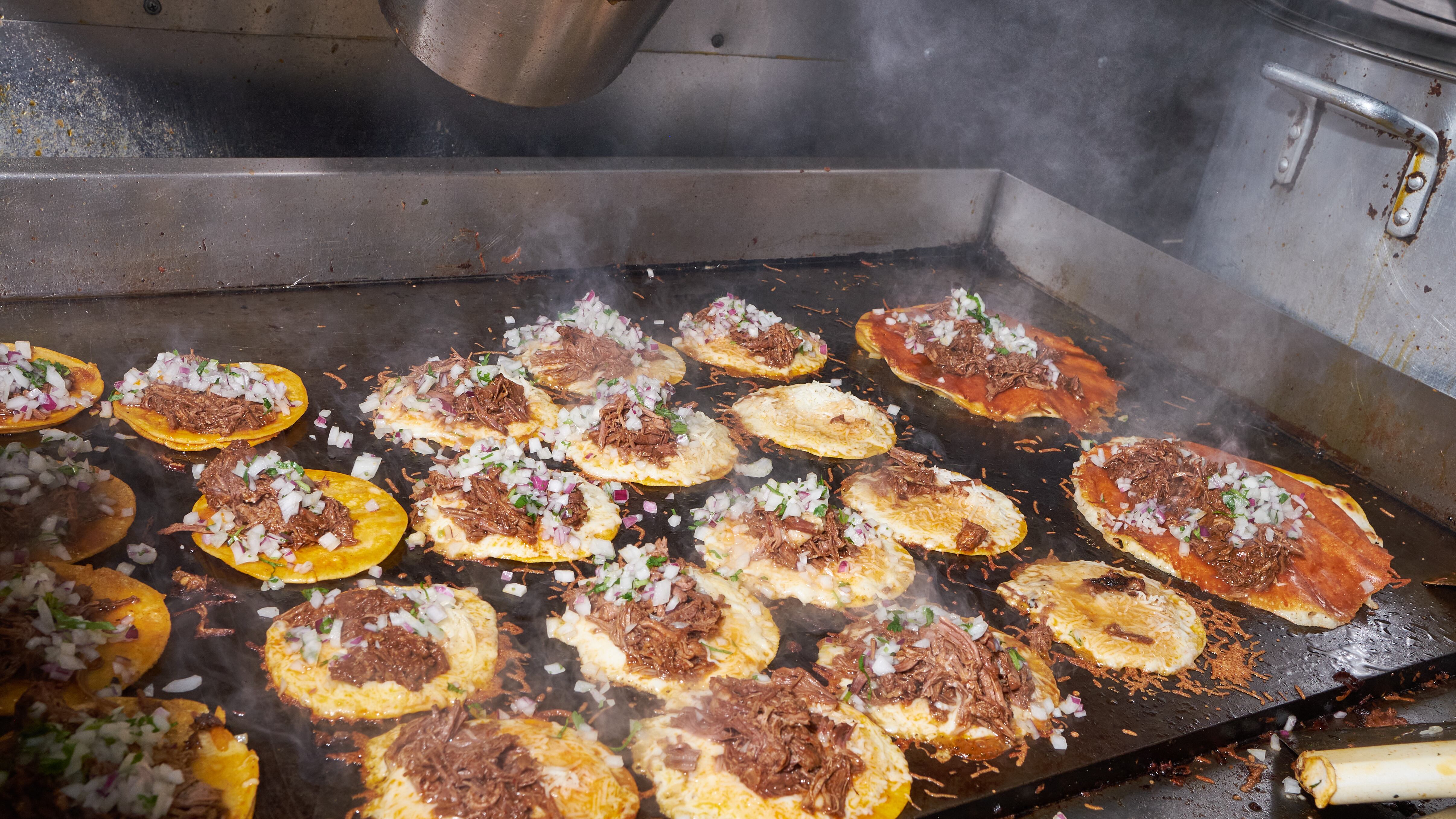 At Birrieria La Plaza, though, one thing remains an unnatural red color: the tortillas. Each one has been dipped in chile-stained fat, before going on the sizzling comal with a generous mound of stewed beef and stringy white cheese to be served up as quesatacos.