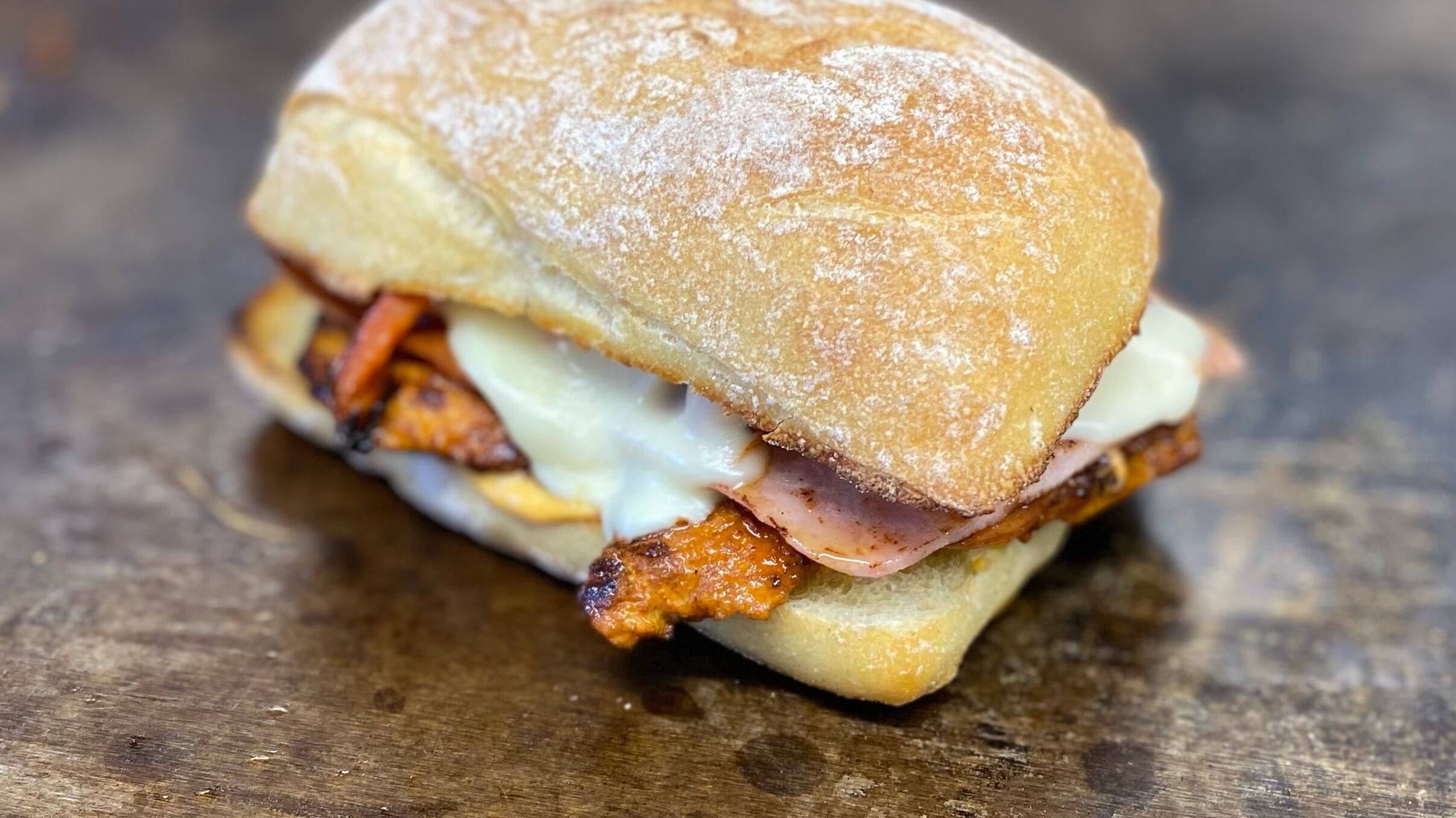 When he dreamed of opening a loncheria in 2018, David Lizaola imagined serving classic Jaliscan lonches on lime- and beer-enriched birote. When he couldn’t find birote in Portland, he pivoted to ciabatta—and while it may not be traditional, it’s still damn good. In the Hot Oli, Lizaola gives his pork loin an adobado treatment by massaging the cuts with a blend of guajillo pepper, herbs, alliums and warming spices. It’s a perfect sandwich.