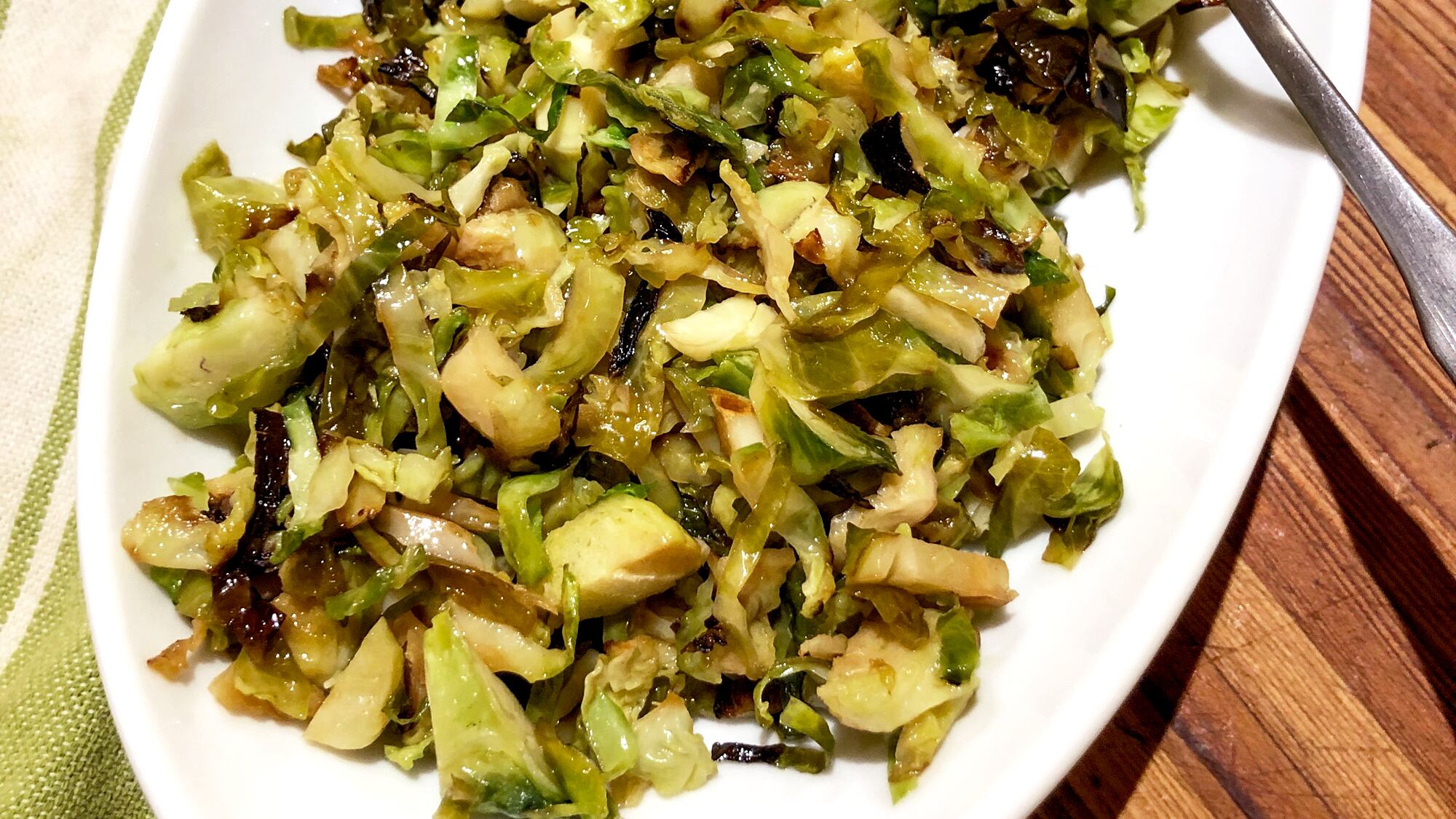 It may come as a shock, but there’s no rule that says you have to cook Brussels sprouts whole. They’re basically little cabbages, and shredding them into thin pieces lets them cook quickly. Brussels sprouts can also take some heat and brown nicely for extra flavor. If you can find them still on the stalk, even better.