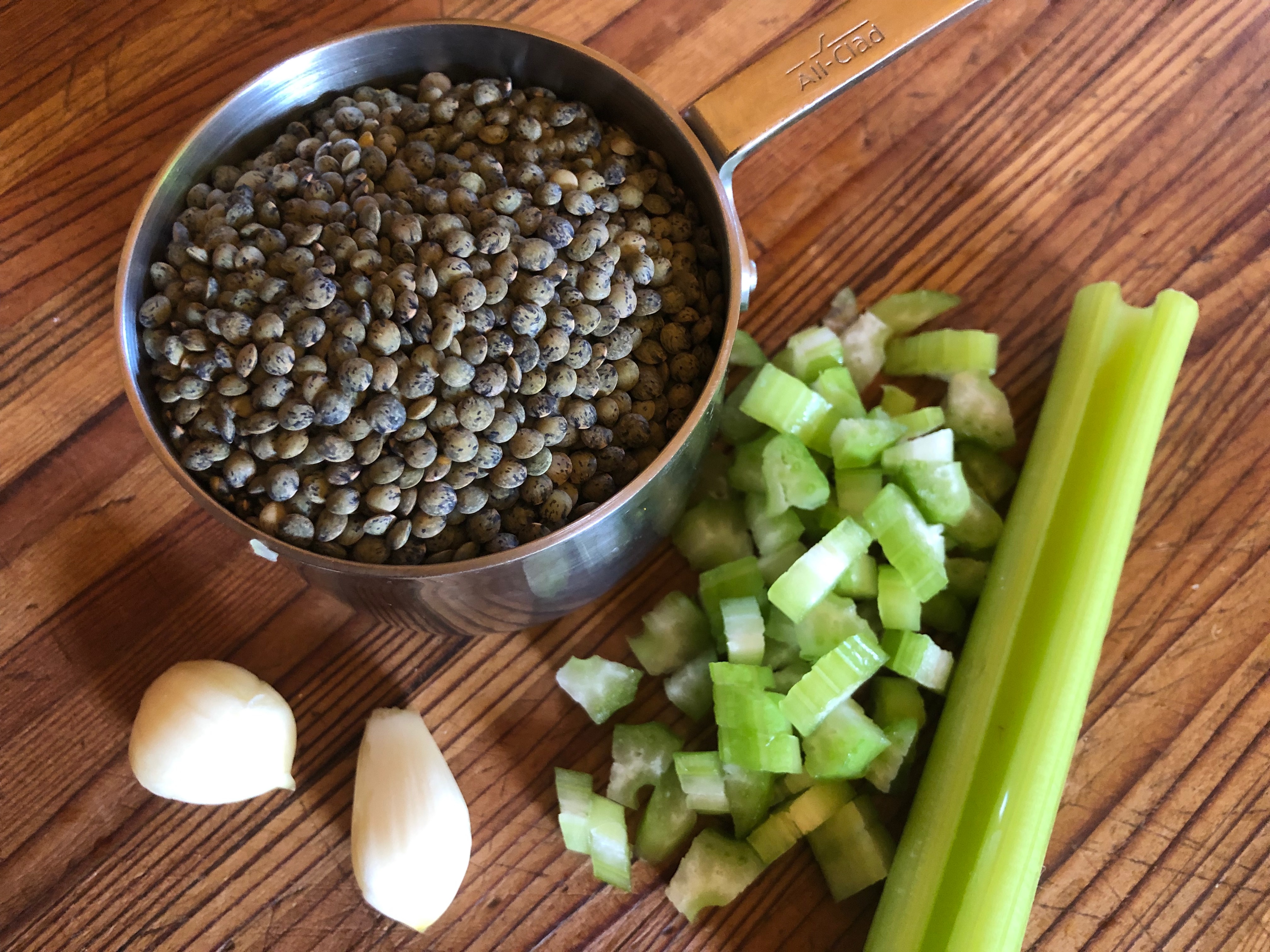 While it’s been a few years since I’ve had those speckled, brown-and-green lenticchie from the mountains of Umbria, I still honor Mauro’s advice and cook my lentils with just garlic, olive oil, celery, salt and water.