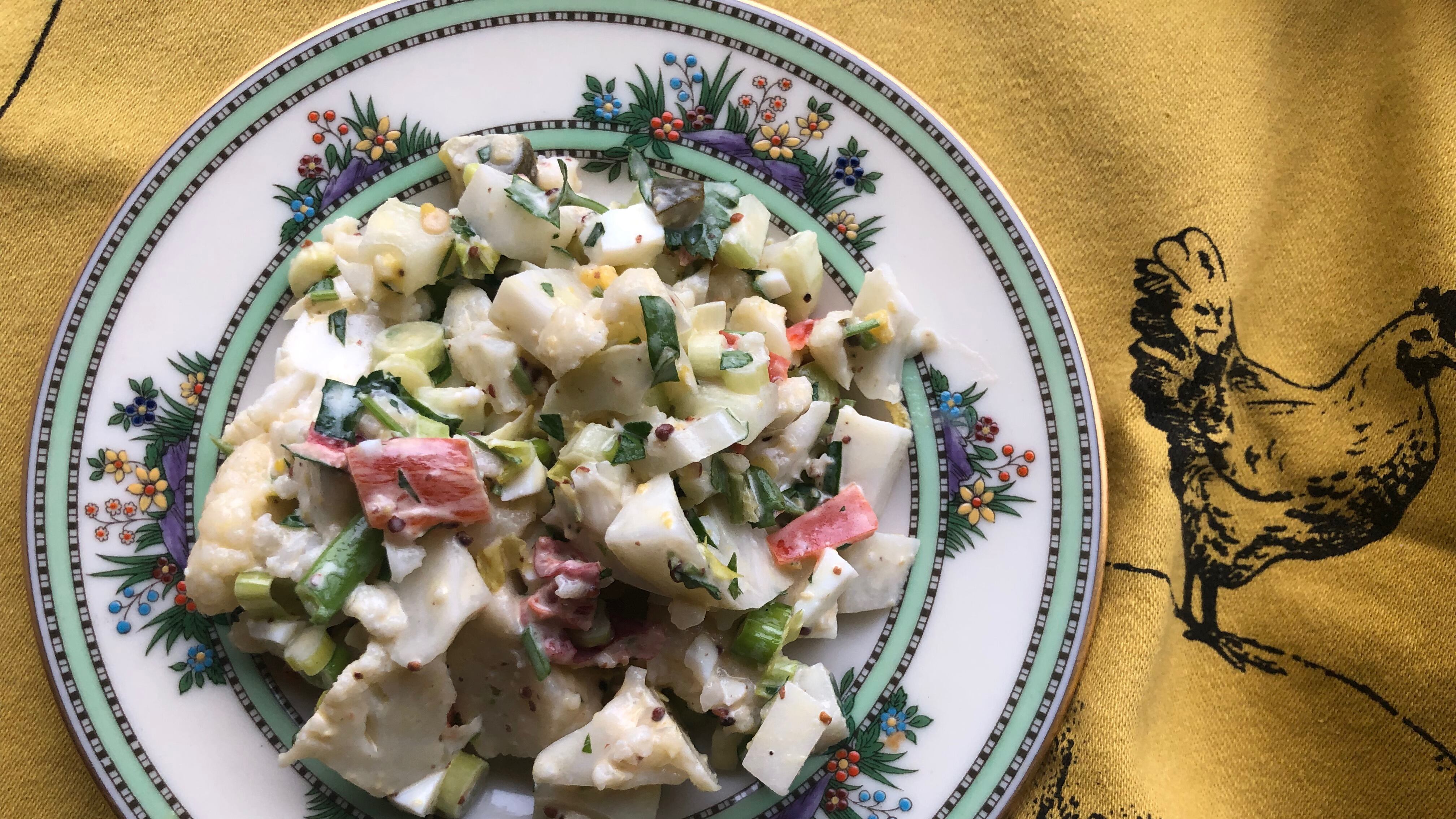 Drop the whole cauliflower in salted boiling water and cook for about 3 minutes. Drain and let cool, then chop coarsely (the core, too). Mix together with remaining ingredients. Season to taste with salt and pepper.