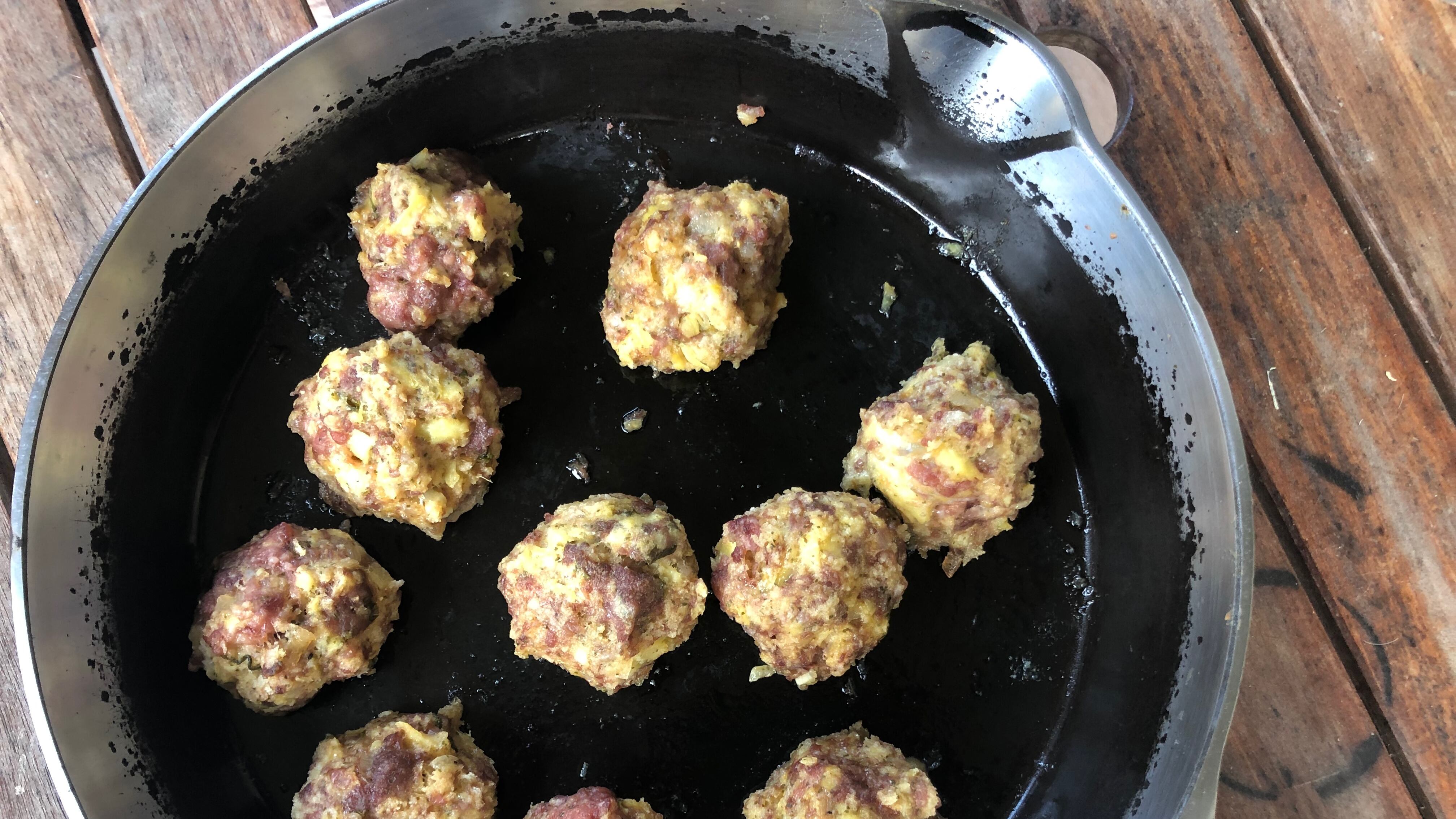 Form rough spheres of the meatball mix—about the size of golf balls. Arrange them in a skillet or on a baking sheet with a little space between them. Bake at 350 degrees for 25 minutes.