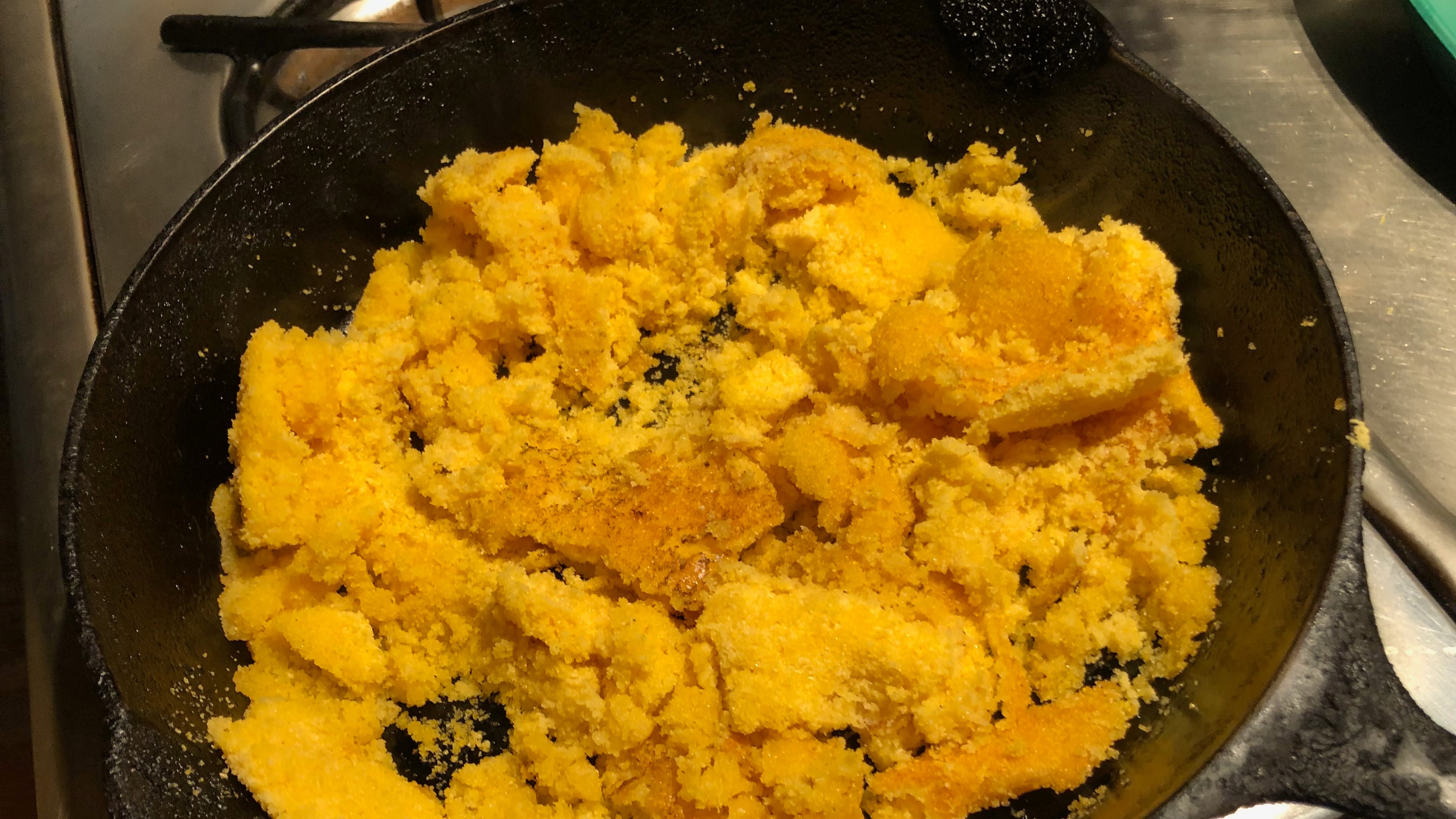 It’s basically pan-fried cornbread. You mix cornmeal with milk or water, some salt and maybe baking powder, then cook it in a skillet on the stove, preferably in bacon grease. Robicheaux usually pours a little milk and cane syrup over his bowlful, but I’ve also seen savory versions with onion, hot peppers, and sometimes cracklins or greens.