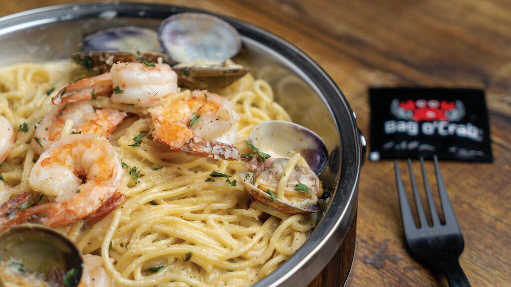 Looking for a good time? Call Bag O’ Crab. There is no way to feel serious about anything—except, perhaps, demolishing a large bag of Cajun-sauced crustaceans—the moment you step through the doors at this new restaurant, thanks to details like the giant lobster mural and a robot waitress. Keep the fun vibes going by ordering Combo 4: a lobster or Dungeness crab, shrimp, crawfish, clams, corn, potatoes and sausages. Use an order of garlic bread to sop up the spicy, buttery boil.