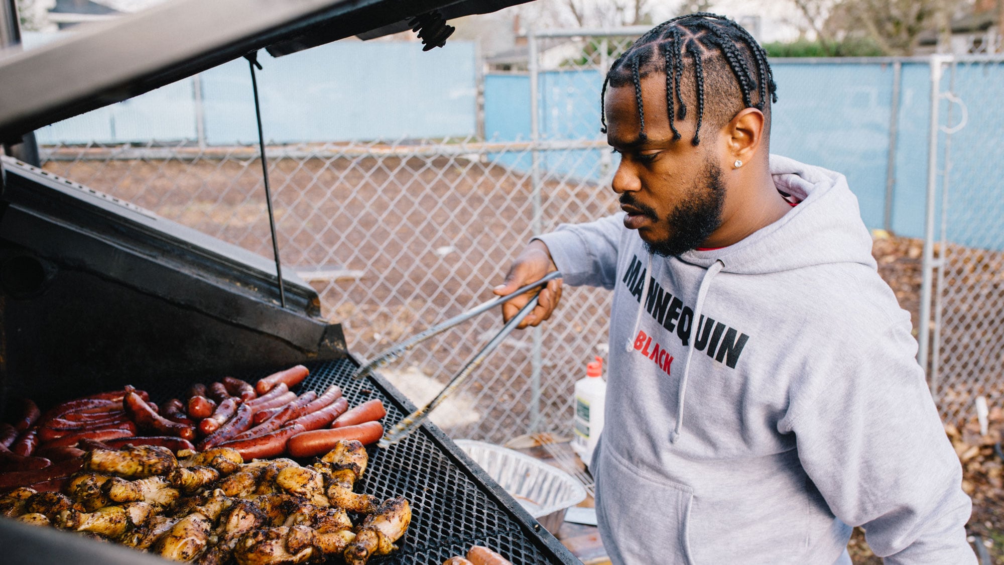 Spank and News started posting pictures of their plates to Instagram, and people started showing up in droves. In Portland, Spank wanted something more permanent, so he hired a local chef, Anders Green, and taught him the ways of the Trap. Then he bought an old cart and styled it with a barred door and tagged up with "Lord Bless The Trap." Everything on the cart is custom—Spank even had a smoker built into the engine compartment so they can do ribs, chicken and sausages on the weekends.