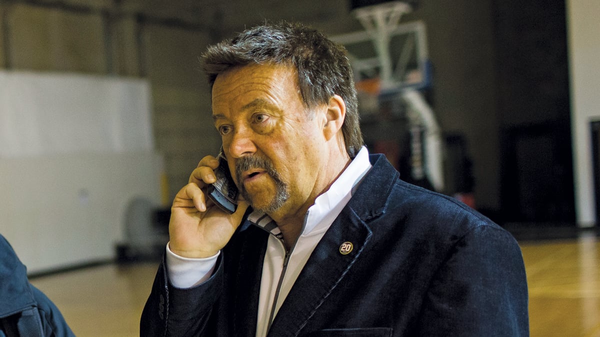 Emmert cultivates the grizzled swagger of an aging gunslinger—if that desperado wore basketball warm-up tracksuits. He's tan, with a salt-and-pepper mustache and what looks like a badger pelt perched on his head.