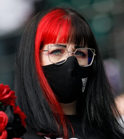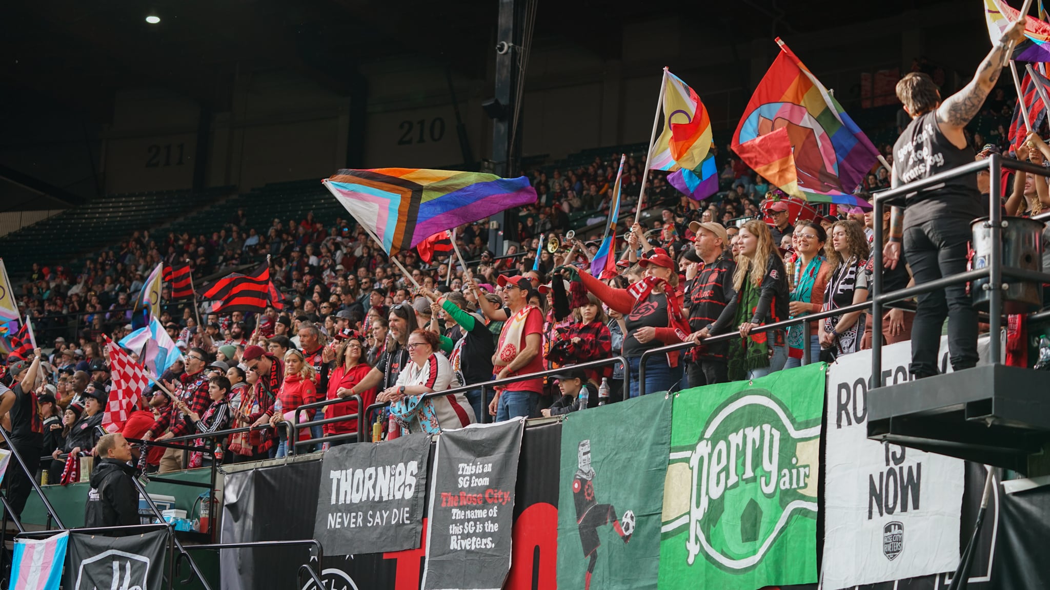 Part of it is her hair: the half-red, half-black bangs under a black and red crown of roses that’s been constant for the past six years. The other is that she’s on the stage at the forefront of the Portland Thorns supporters section in the north end of Providence Park, leading fans through chants, monitoring the crowd, and sneaking glances to her left to catch the action on the field—and to check for the occasional errant shot over the net that might find its way into the stands.