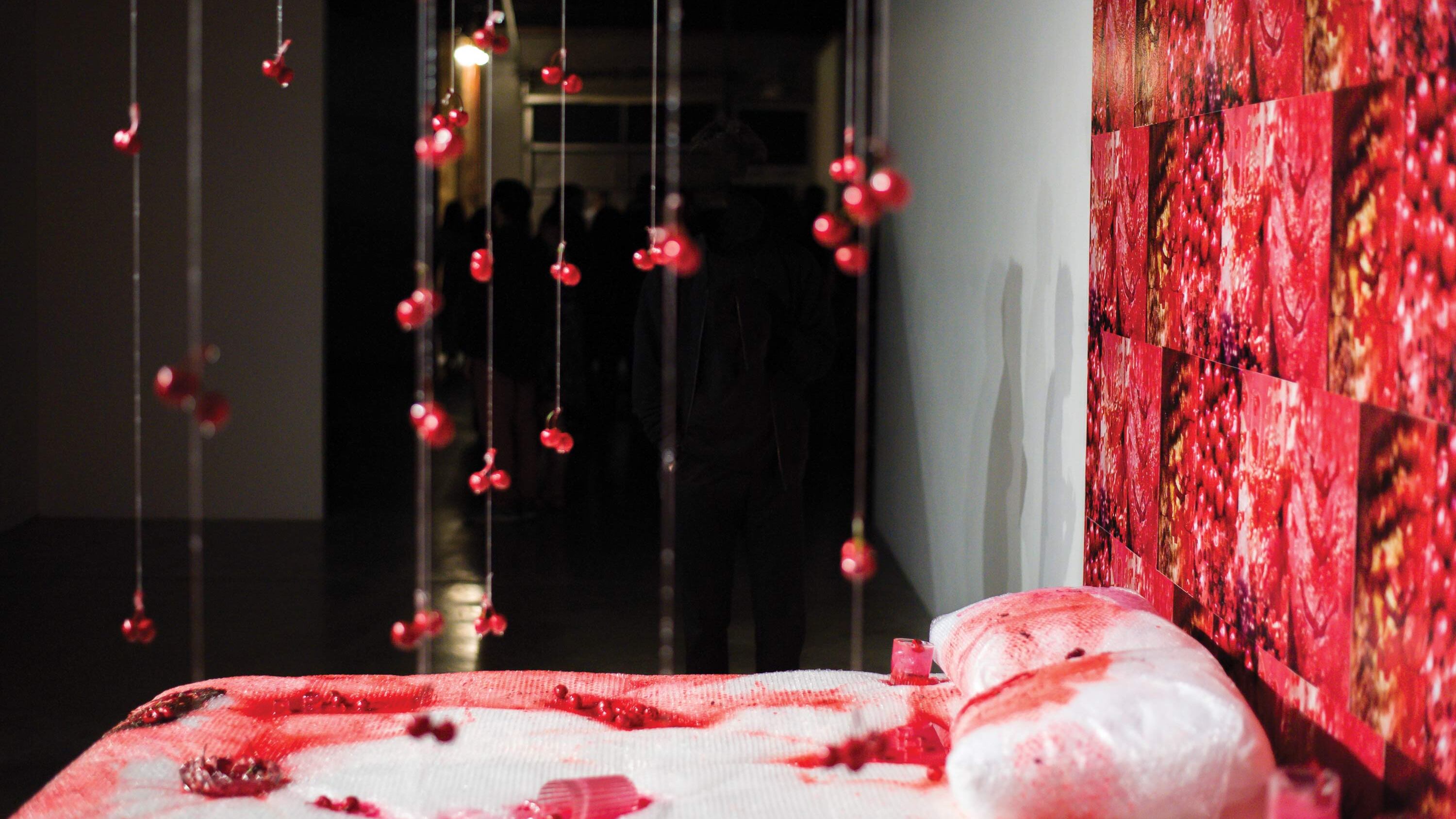 A Situation of Meat is the first of four shows that Greenway will create as Disjecta's curator in residence. Even partially finished, it's epic: five massive installations in the cavernous Kenton gallery. There's Virginia artist Braxton Congrove's collection of pink squiggly sculptures that vaguely resemble intestines, and yellow ovals that Greenway calls "eggs" but look more like pills: large, two-toned capsules nestled on a fluffy pink pillow. In And Don't Call Me Shirley, by Portland artist Maggie-Rose Condit, fake maraschino cherries are suspended over a king size bed that's soaked in goopy, red-tinted corn syrup.